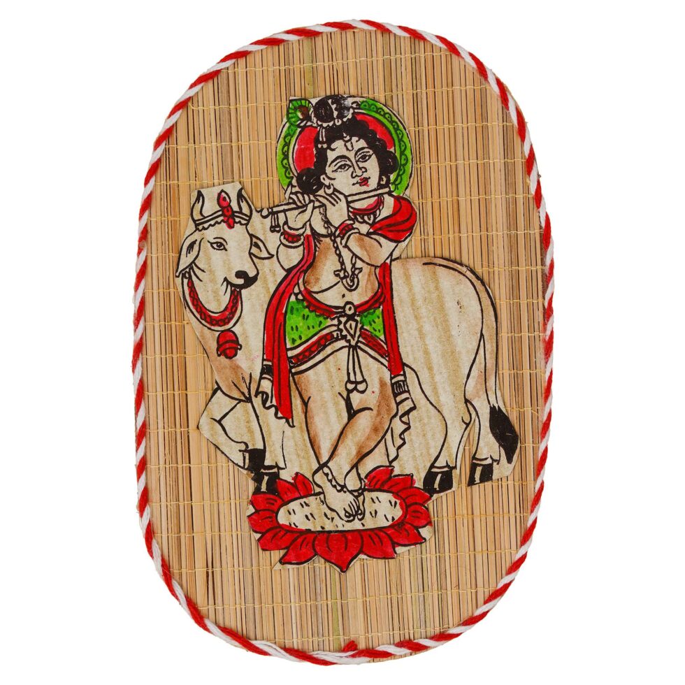 Oval Shaped Design Bamboo Hand Crafted Wall Hangings Of Bal Gopal With Holy Cow For Home Decor | Bamboo Art For Wall Decor