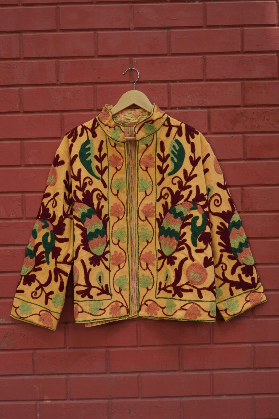 Womens Yellow Velvet Embroidered Jacket with Floral Design